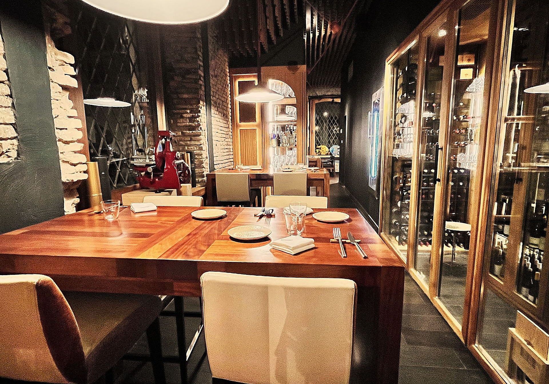 Lo que gana aún más protagonismo es la bodega. De hecho, el restaurante mantiene su emblemático techo como cavas flotantes que reflejan ese peso del vino que se busca potenciar en esta nueva etapa. No en vano, el establecimiento suma ya unas 500 referencias, y pretende seguir ganando puntos con el apoyo de David Orellana, sumiller de Cávala, tercer vértice del triángulo hostelero del mismo sello que completan La Deriva y Cobalto 15.