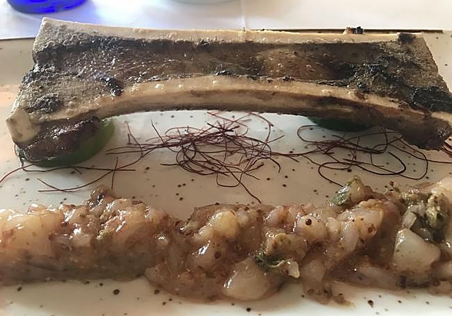 Mucho más fino y untoso este tartar de gamba blanca con tuétano pasado por el josper es un compendio de constrastes de sabor y de temperatura en cada bocado. Muy conseguido en boca por su potente sabor.
