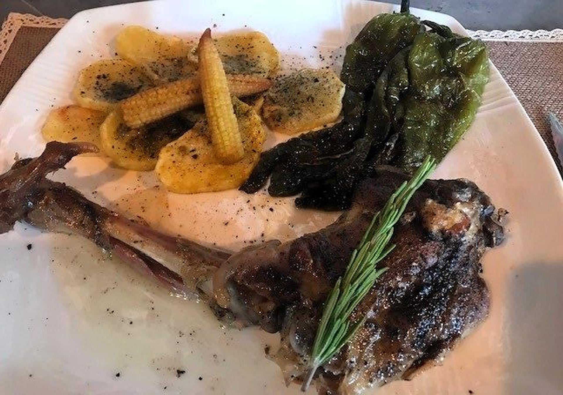 Pata de chivo a la brasa: Una pata de chivo asada y que llega a la mesa en su punto justo de fuego para que el sabor y los jugos se mantengan uniformes. Tamaño adecuado, buena calidad del chivo de Canillas y una guarnición tradicional para realzar este plato.