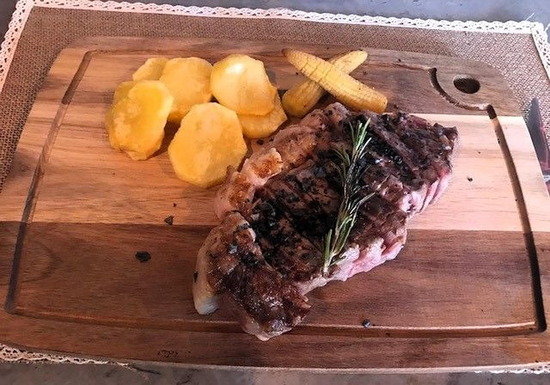 Precios: Patatas bravas: 6,50€ Entrecot vaca: 25€ Pata de chivo: 18€