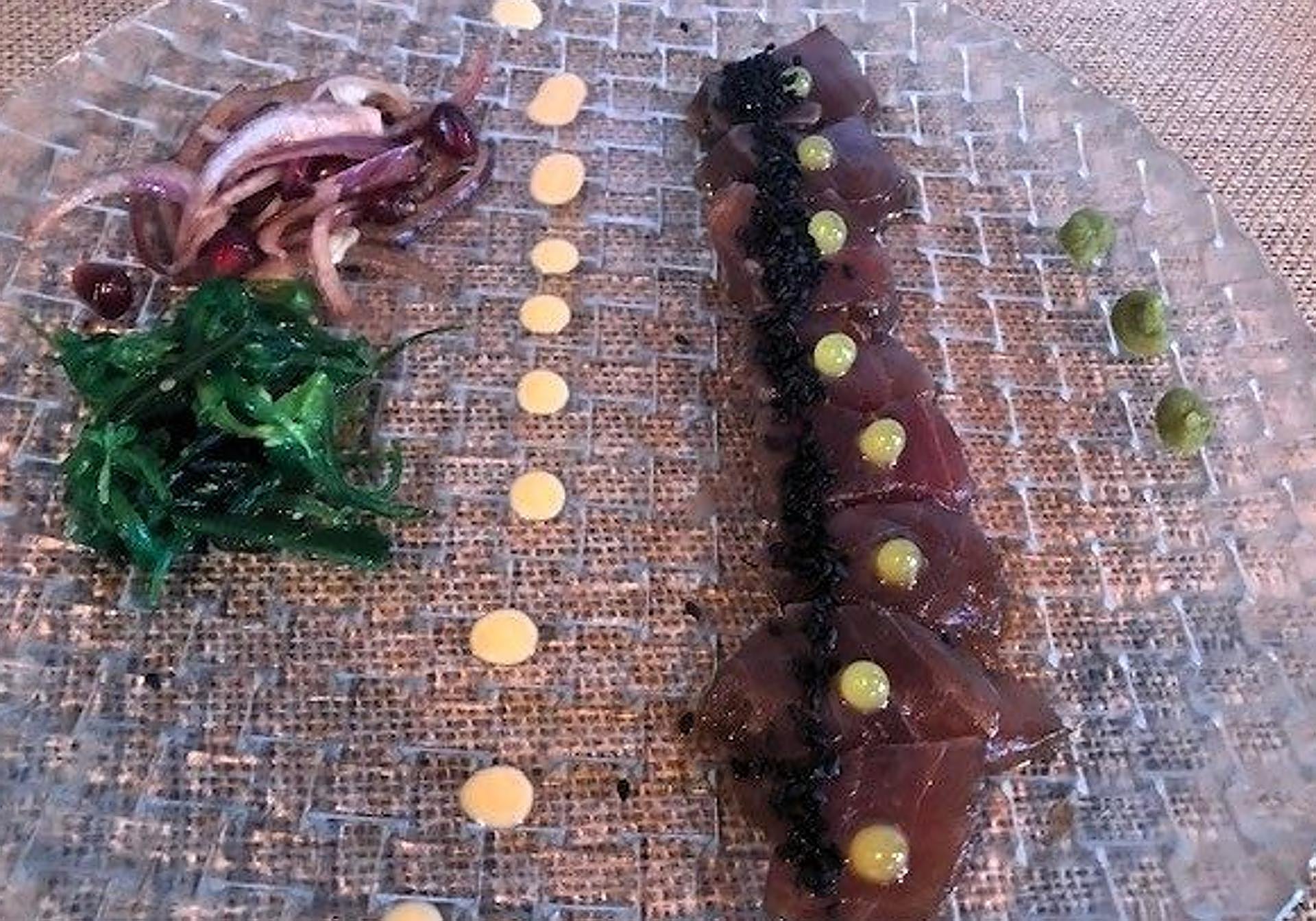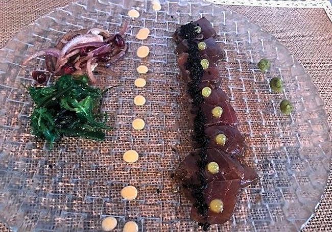 Tataki de atún rojo: Pocos secretos a la hora de elaborarlo tiene un tataki de atún, por otra parte un plato que ya empieza a ser demasiado reiterativo en las cartas de los restaurantes malagueños. En esta ocasión, un corte correcto y una calidad aceptable del atún.