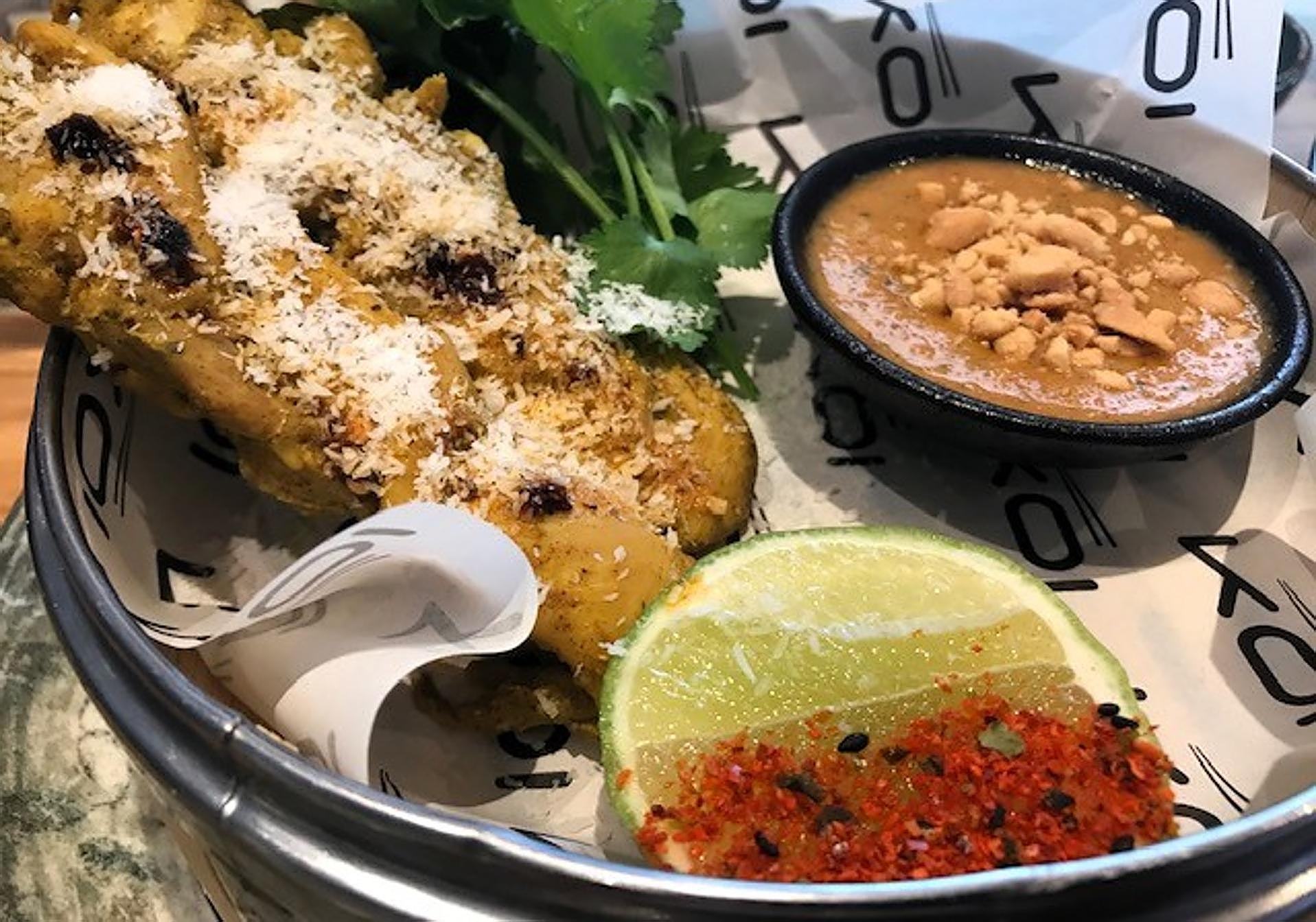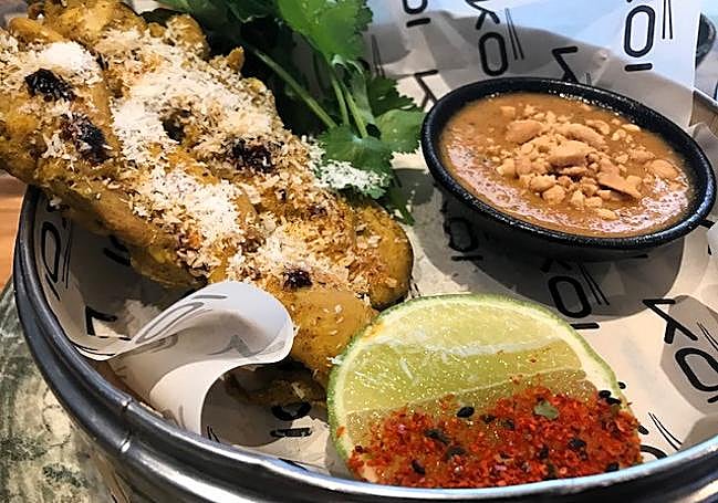 Esta brocheta o satai tiene el equilibrio perfecto entre la salsa picante de cacahuete y el chile con la acidez de la lima y el toque justo de cilantro. El lomo de pollo presenta además un toque de plancha suave para que no pierda jugosidad.