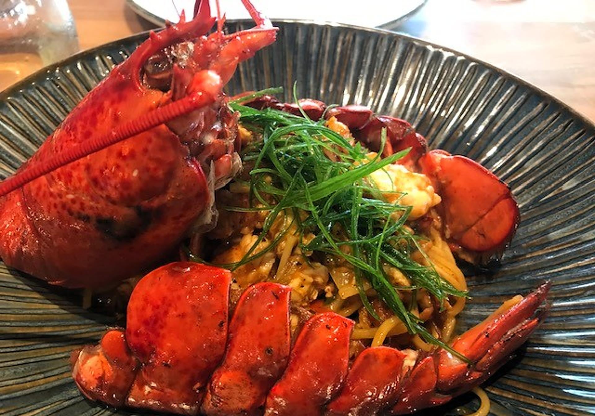 Plato contundente por sí mismo atendiendo al tamaño del bogavante, supera los 500 gramos, que se sirve acompañado de unos fideos salteados y una bisqué de marisco previamente enriquecida con una suave salsa de habas amarillas.