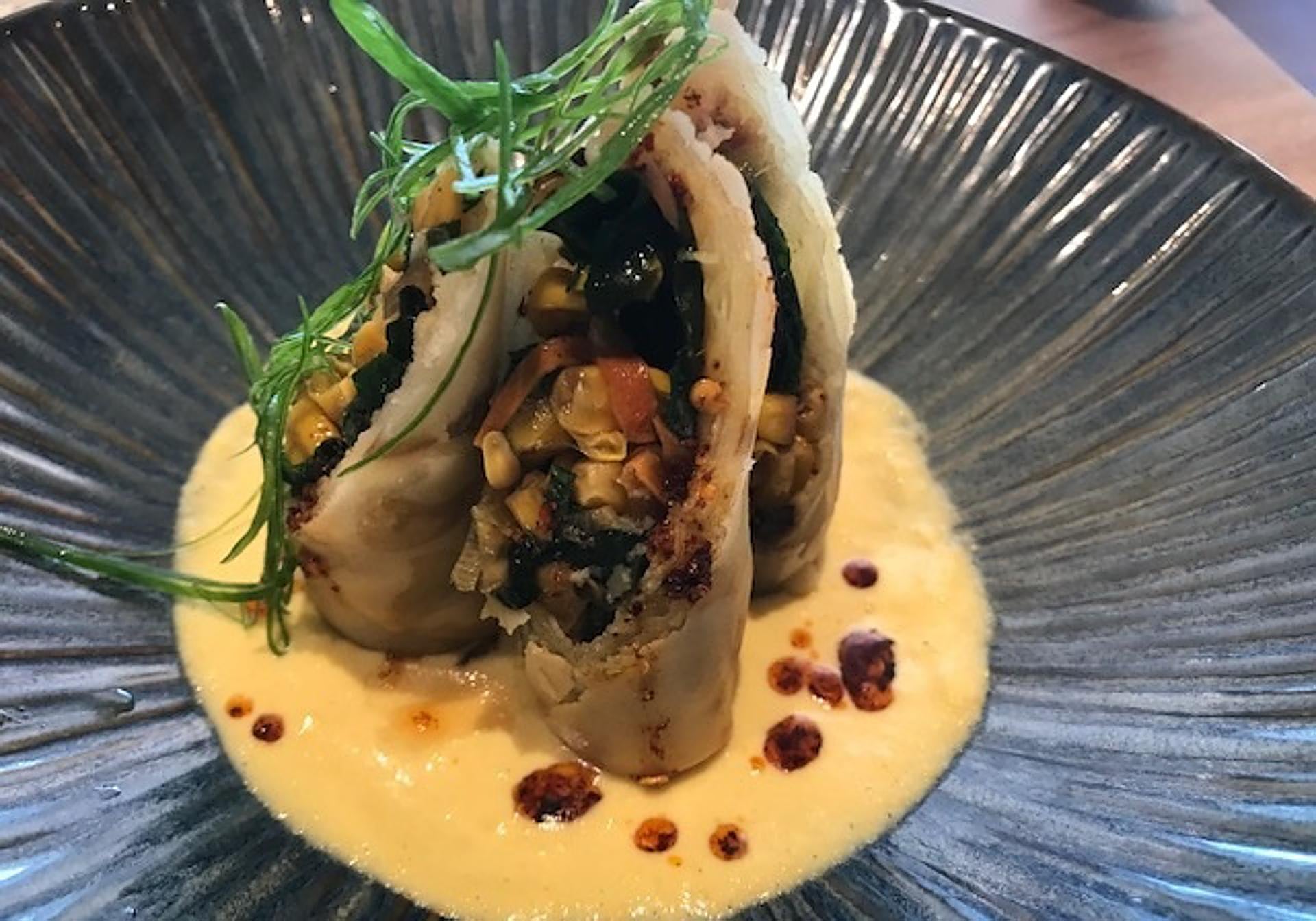 No es el clásico rollito primavera que se acostumbra a servir en los restaurantes de cocina china, todo lo contrario, es un rollo partido en dos y que se rellena con espárragos verdes, rábano encurtido y setas.