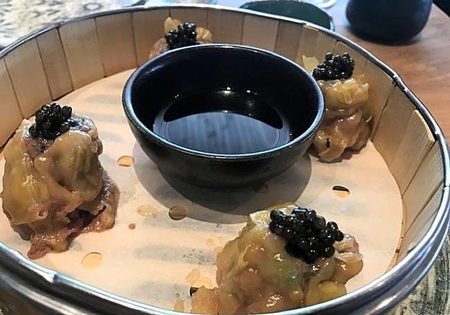 Un correcto dim sum relleno de carne de wagyu y que se sirve con una cucharadita de caviar oscietra. La salsa de ponzu cítrica servida aparte en el plato va a realzar y cambiarnos el sabor del propio Siu Mai.