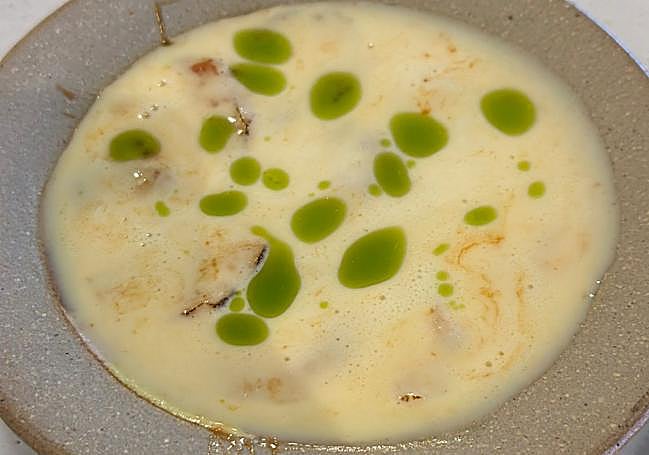La incorporación de este cocinero con una visión de lo que tiene que ser una marisquería contemporánea le ha llevado a preparar una delicada sopa fría a base de vieiras con leche de tigre para realzar y reforzar todavía más el sabor del marisco.