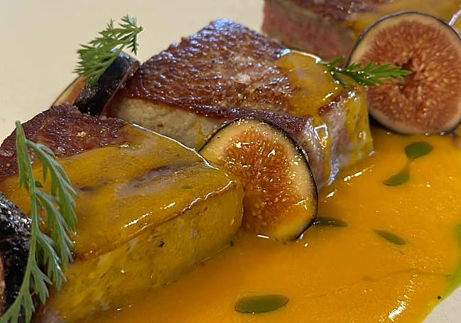 Suavidad equilibrada con la contundencia que tiene una buena ventresca de atún previamente escabechada con zanahoria y naranja cuando se pasa levemente por la plancha. Las láminas de higo aportan dulzor.