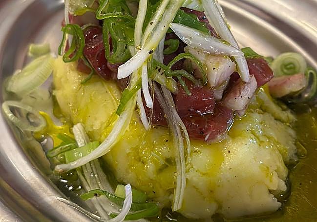 A simple vista puede parecer uno de los platos más sencillos de toda la carta, pero grave error. Fernando prepara unas papas aliñadas al estilo tradicional gaditano pero con unos taquitos de atún rojo acompañados de anguila ahumada. ¡Genial!