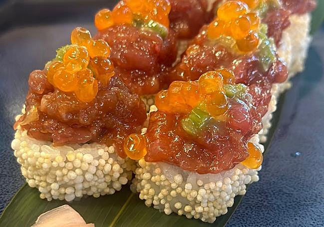 Una buena y amplia selección de sushis, sashimis y uromakis que se elaboran en otro espacio junto a la marisquería. Atún y huevas de salmón son una combinación perfecta para un urumaki templado, crujiente y con un toque de melosidad.
