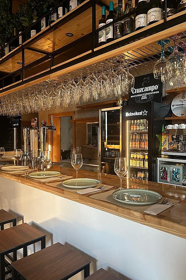 Su propuesta también se traslada a la propia decoración y ambiente del local. Una taberna organizada en dos zonas claramente diferenciadas: una de mesas bajas y mantel al estilo restaurante, y otra de mesas altas y taburetes, con un aire mas urgente y casual, y el protagonismo de una gran barra de madera natural barnizada. «Mezclamos una decoración moderna con la tradición de la barra con taburete alta, en la que poder desgustar un vino o una tapa; al tiempo que también ofrecemos mesas para disfrutar de un almuerzo más extenso», explica Ezequiel.