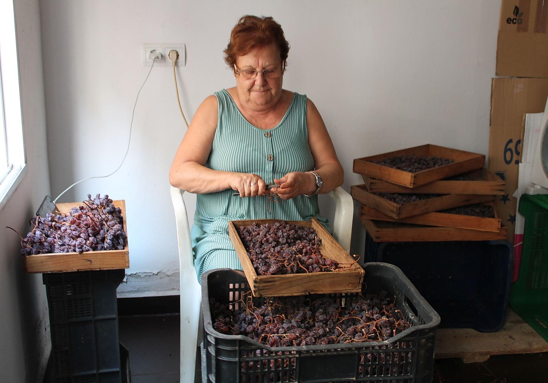 5 Una vez que las pasas están secas en los paseros, se recogen y se llevan a los conocidos como lagares, donde comienza la fase del picado. Una a una se van cortando de los racimos con pequeñas tijeras sobre los denominados 'formaletes', en una labor en la que, tradicionalmente, suelen participar las familias. Antaño era una tarea encomendada sobre todo a las mujeres, aunque hoy no siempre es así. También hay racimos que no pasan por ese proceso, ya que se reservan para venderse directamente así en cajas. Suelen ser seleccionados por su tamaño y por su forma para que luzcan mejor en los conocidos como 'chatos' o 'catites', envases tradicionales para las uvas que no han sido picadas. Por sus tamaños para la venta existen hasta cinco categorías: Extra, primera, segunda, tercera y una cuarta que se suele descartar. En la jerga de los que trabajan las pasas en la Axarquía esos tipos de pasas serían, respectivamente, de mayor a menor calibre, la reviso, la media, la aseada, la corriente y la escombro. Esta última por su tamaño puede ir destinada a otros usos, como la elaboración casera de vinos.