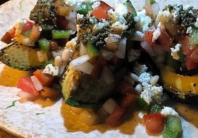 Esta especialidad más pudiera ser un homenaje al aguacate malagueño acompañado de ciertas verduras, donde la cebolla roja cruda combina muy bien con la melosidad y temperatura del aguacate al haber pasado previamente por la brasa.