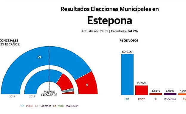 Con el 61 por ciento del voto escrutado, el Partido Popular vuelve a ganar de manera aplastante en Estepona dejando una corporación casi monocromática con ... 21 de los 25 concejales. El PSOE baja de seis a cuatro ediles y desparacen de la corporación IU y Podemos. Las nuevas fuerzas que optaban a la alcaldía, Vox y Ciudadanos, no han conseguido representación ante la avanlancha popular.