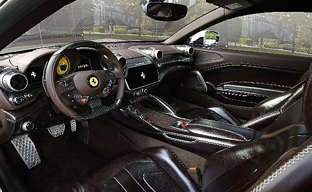 La nueva solución de diseño de cabina crea la impresión de un par de arcos que se extienden longitudinalmente desde el pilar A hasta el alerón trasero. El volumen trasero del arco se ha ahuecado para crear un canal aerodinámico con la salida de aire oculta por la fascia trasera negra debajo del spoiler. Esta versión moderna del tema del 'contrafuerte volante' de Ferrari conecta firmemente el automóvil con las características del estilo del Cavallino Rampante, no solo de la tradición GT de Ferrari, sino también de autos deportivos como el 599 GTB Fiorano. Para aligerar visualmente la cabina, la pintura negra del techo conecta visualmente el parabrisas con la luneta trasera, que se encuentra sobre la superficie del portón trasero como para canalizar el flujo de aire.