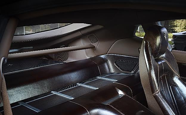 El interior del BR20 no es menos impresionante, adornado en dos tonos de cuero marrón y fibra de carbono, una combinación exquisita desarrollada según las indicaciones del cliente. Los asientos están tapizados en cuero Heritage Testa di Moro marrón oscuro y lucen un patrón exclusivo en la parte delantera, así como costuras de cruz plateadas. El volumen de la cabina se extiende ininterrumpidamente desde el parabrisas hasta el maletero en la parte trasera, creando una sensación de ligereza y ligereza únicas para los ocupantes. La moldura de roble con inserciones de fibra de carbono adorna el banco trasero y la plataforma para equipaje, que oculta un área de carga más profunda cuando se pliega en plano, así como las manijas de las puertas.
