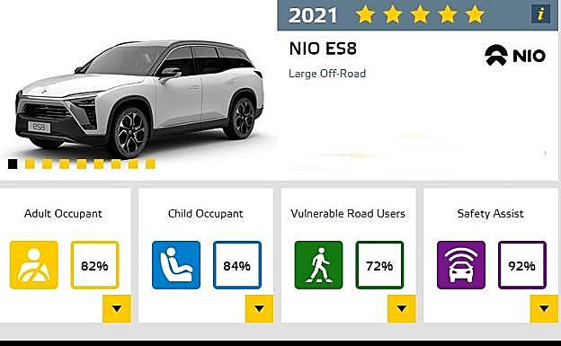 Así, el NIO ES8, a la venta en Noruega, obtiene «excelentes resultados para su sistema de frenado de emergencia autónomo», destacando en sus ayudas a la seguridad activa (ADAS). Este modelo es un SUV de seis plazas 100% eléctrico, y obtiene una puntuación del 92 por ciento en asistentes de seguridad.