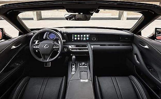 El Lexus LC 500 Cabrio descapotable sólo está disponible con motor V8 de gasolina de 477 CV, una caja de cambios automática de diez relaciones y tracción trasera. Un modelo de lujo que lleva parejo un precio para sibaritas, 155.000 euros. En el interior la calidad de materiales es Premium, con cuero en todas partes -salpicadero, puertas, reposabrazos, asientos…- .