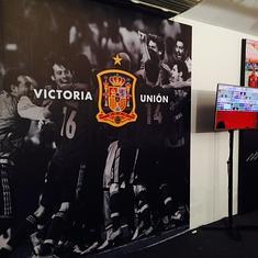 Curiosamente en la sala en la que hablan los deportistas, se habían colocado por vez primera tres paneles con fotos del equipo con tres lemas similares: Victoria, unión (con una foto del equipo celebrando el pase tras tumbar a Portugal a penaltis), El grupo, a Fuerza (con la imagen oficial de los 23 seleccionados para este Mundial) y por último una con El grupo en la que se veía una piña de futbolitas abrazados tras un gol en Sudáfrica.