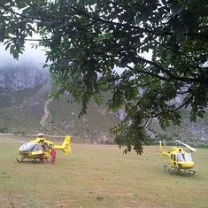 En el operativo de asistencia puesto entonces en marcha se movilizaron tres helicópeteros, dos de Bomberos de Asturias y un tercero de la Guardia Civil, aunque las malas condiciones climatológicas solo permitieron actuar a uno de ellos inicialmente, el de los bomberos. Fue de hecho el personal trasladado en esta aeronave el que se ocupó de la asistencia de los seis heridos, que presentaban policontusiones e hipotermia. La primera valoración es que no tenían heridas graves. A las 17.51 horas el equipo de rescate de Asturias confirmó que estaba con los afectados.