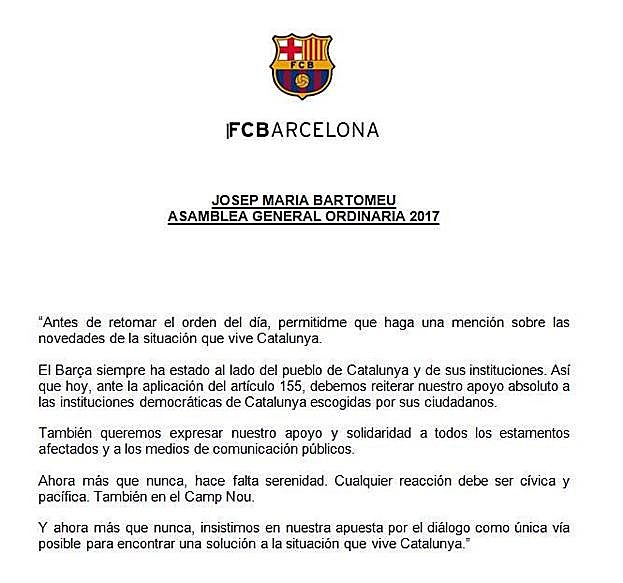 Un Bartomeu que modificó su discurso tras el anuncio del artículo 155, insistiendo en la vía del diálogo para solucionar el conflicto catalán, después de que pidiera a toda la clase política que ninguno de ellos se apropiara, en términos políticos, del Barça. "Nadie puede dudar del Barça. Defenderemos los principios de democracia el derecho a decidir, siempre respetando a la masa social. Sabemos que el Barça es más que un club, que el Camp Nou es un espacio de respeto. Hay que respetar a todos, a las mayorías y a las minorías, respetar a todas las instituciones y a todas las ideas. Es inadmisible que en un país democrático haya personas encarceladas por sus ideas políticas. El Barcelona no será un instrumento manipulable para los intereses políticos, nadie puede apropiarse de nuestro escudo y de nuestra bandera", explicó Bartomeu.