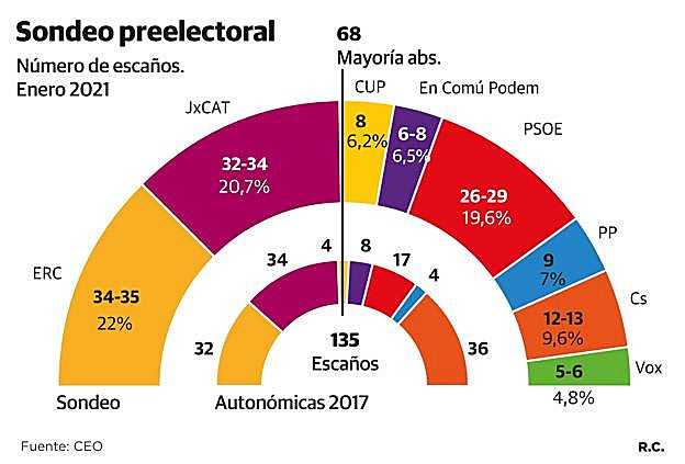 La victoria del 14-F se perfila como un mano a mano entre Esquerra y JxCat, con el PSC a una distancia corta, según ... la encuesta del CEO (CIS catalán) hecha pública esta mañana en el primer día de la campaña electoral. A dos semanas de las elecciones, el sondeo del centro de estudios de la Generalitat pronostica un triunfo en las urnas de ERC, con 34-35 escaños, pero con un muy pequeño margen respecto a JxCat, que obtendría entre 32 y 34 diputados. Las dos fuerzas secesionistas, socias en el Govern, están en un pañuelo y se van a jugar la victoria en quince días de campaña, como ya ocurrió en las últimas autonómicas en que los republicanos lideraban los sondeos y al final fueron rebasados por los postconvergentes.