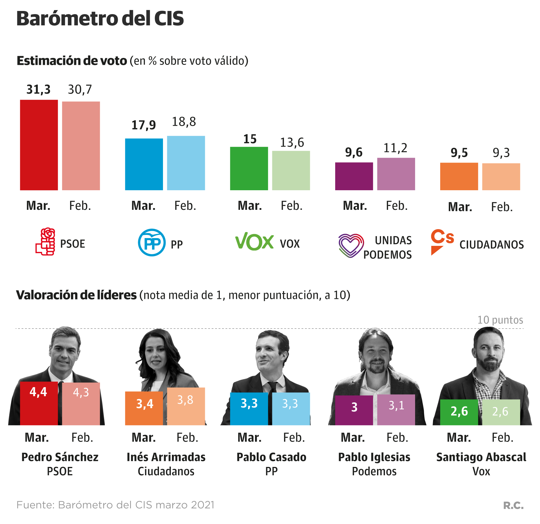 Según el CIS, el PSOE volvería a ganar las elecciones generales con un 31,3% de los votos y una ventaja de hasta 13,4 puntos sobre el PP, que se quedaría en el 17,9% de apoyos. La brecha entre socialistas y populares se ensancha prácticamente encuesta tras encuesta del CIS. A modo de ejemplo, en la repetición de las generales de noviembre de 2019, Sánchez obtuvo un 28,3% de los votos frente al 21% de Casado. Ya entonces le resultó suficiente al PSOE para gobernar con el apoyo de Unidas Podemos y el respaldo externo, y costoso, de las formaciones independentistas.