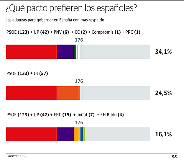 Los planes del presidente y las preferencias de la sociedad van por caminos diferentes en lo que a modelos gubernamentales se refiere. El barómetro de mayo señala que el 45,2% de los españoles es partidario de un gobierno socialista coaligado con el partido de Pablo Iglesias y los nacionalistas moderados. Esta alianza tiene el respaldo del 53% de los votantes del PSOE y del 73% de los de Unidas Podemos.