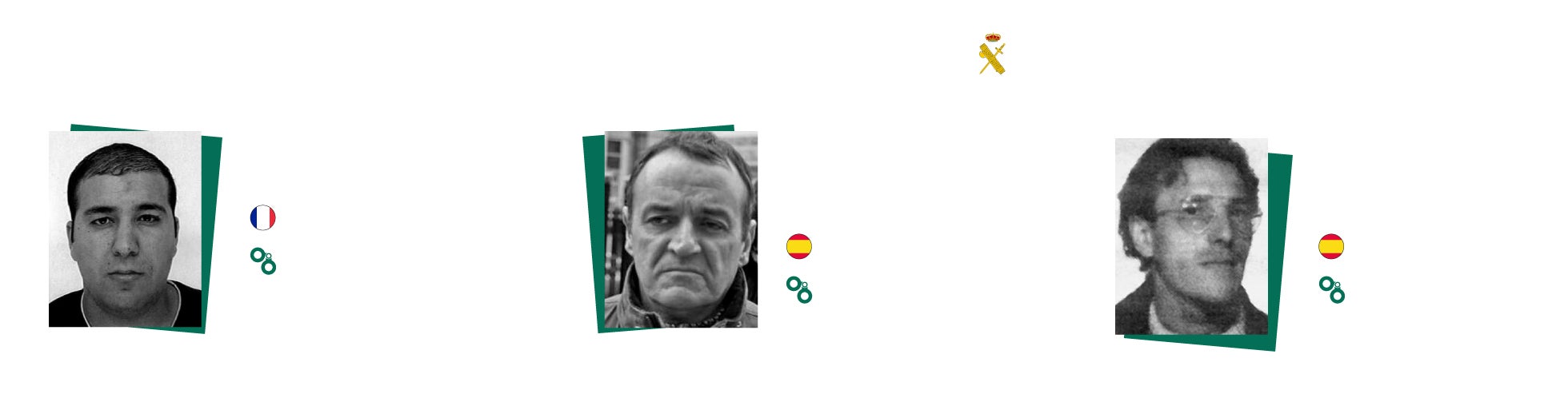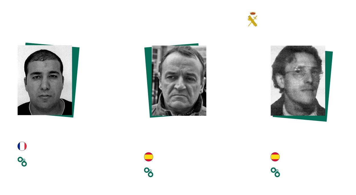 La Guardia Civil también tiene sus listados de 'most wanted' pero este cuerpo es el que menos difusión da a sus elencos que, aun así, también son distribuidos en redes por los internautas. El instituto armado tiene a día de hoy 20 fugitivos en sus más buscados. 14 de ellos son etarras huidos. La Guardia Civil es el cuerpo que con más afán sigue manteniendo 'viva' en las redes la búsquedas de los exactivistas de la banda terrorista disuelta hace más de una década. Dos rostros históricos destacan: José Ignacio de Juana Chaos, huido desde 2008 tras volverse a ordenar su captura después de cumplir 18 años de cárcel de los 3.000 que se le impusieron; y José Luis Eciolaza Galán, alias 'Dienteputo', acusado de una veintena de asesinatos en los ochenta.