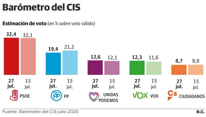 La encuesta, realizada entre el 9 y el 19 de julio es la primera publicada después de las elecciones del pasado 12-J en Galicia y Euskadi, en la que el PSOE se mantuvo en los resultados de hace cuatro años y Podemos sufrió un batacazo electora, y tras el acuerdo alcanzado en Bruselas para la reconstrucción tras la covid, por el que España recibirá 140.000 millones de euros.