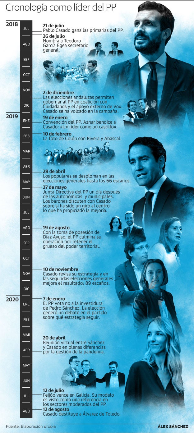 «El paso del tiempo da y quita razones -argumenta un cargo popular-. Y, en este caso, ha llevado a Casado a comprender que con fichajes como el de Álvarez de Toledo para puestos de primera línea no se representa a la sociedad de hoy». En el PP asisten estos días a la crisis, «atenuada por ocurrir en el mes de agosto», con la impresión de que el líder de los populares «enmienda» algunas de las decisiones que ha adoptado desde que en 2018 tomó el relevo de Rajoy. Un cambio de táctica, como le habían sugerido numerosas voces, para intentar poner rumbo a la Moncloa. «Esta vez -dicen- se la juega».
