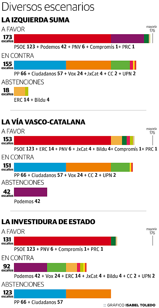 El candidato socialista solo puede esperar de Unidas Podemos una abstención como mal menor tanto el 23 como el 25 de julio. En el caso de los independentistas es improbable que consiga votos favorables. Esquerra y EH Bildu ya han dicho que más allá del voto en blanco no van a ir. Sería una pirueta en toda regla que respaldaran a Sánchez. Junts per Catalunya se debate entre el no, que propugna el sector más beligerante que capitanea Carles Puigdemont, y la abstención que cuenta con adeptos en el PDeCAT, entre ellos Artur Mas.