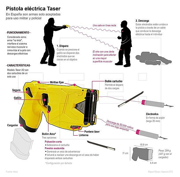 La capital quiere adquirir doscientos dispositivos 'taser' -el modelo más habitual es de esta marca, que se usa como nombre genérico- para repartirlos entre las 22 unidades de distrito y en unidas específicas, lo que supondrá una inversión de 500.000 euros -alrededor de 2.000 euros por dispositivo-.