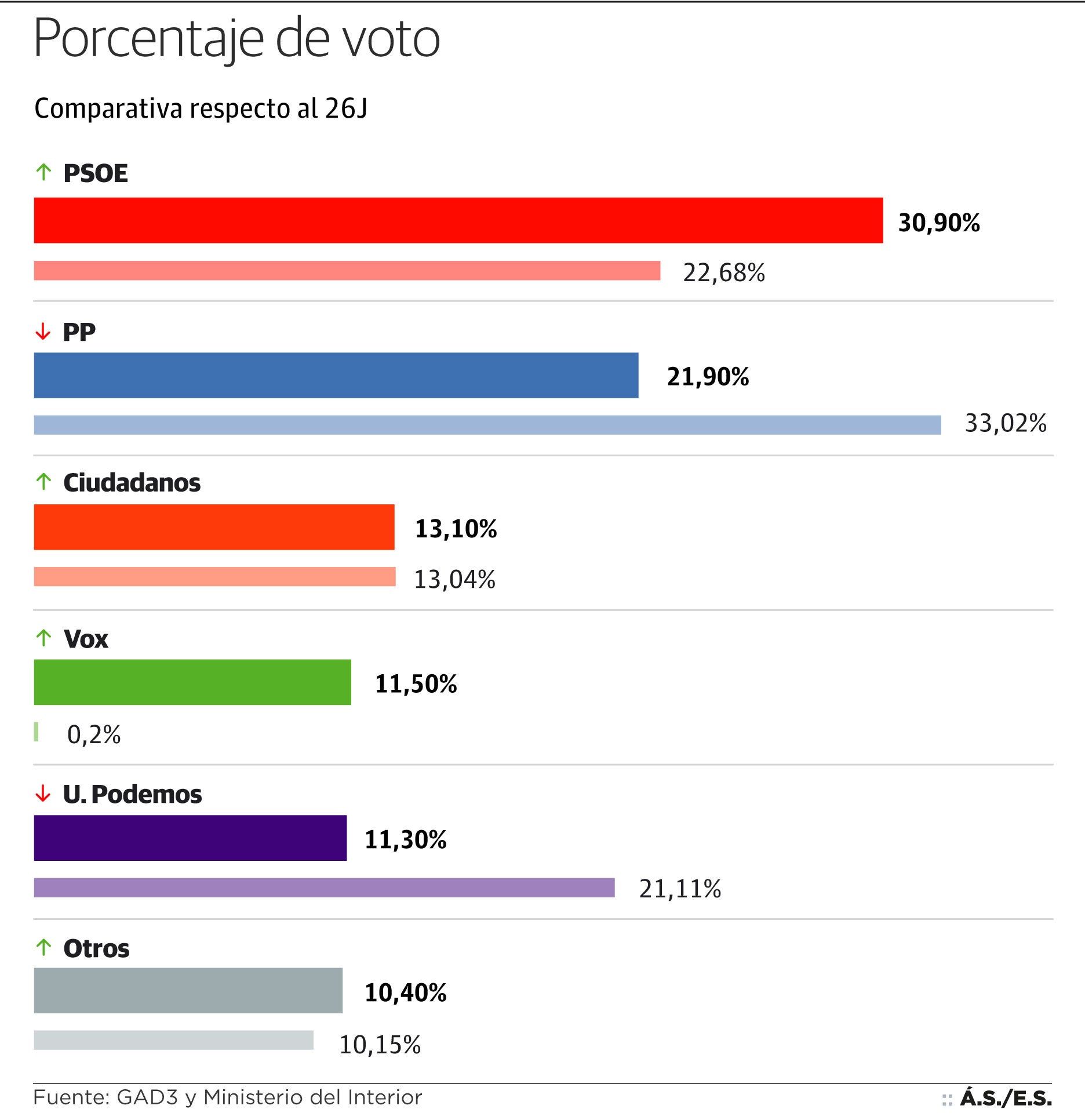 A casi un mes de las elecciones generales, el PSOE mantiene su marcha ascendente y sería el partido más votado el 28 de abril, con ... casi el 31% de los votos y entre 131 y 134 escaños en el Congreso. El PP mejora sus expectativas, pero se vería perjudicado por el declive de sus previsibles aliados, Ciudadanos y Vox. Los populares estarían entre los 94 y 99 diputados y casi el 22% de los sufragios, pero los liberales y la extrema derecha se quedarían entre 37 y 38, y 24 y 27. El retroceso también alcanzaría a Unidas Podemos, que caería a 27 diputados.