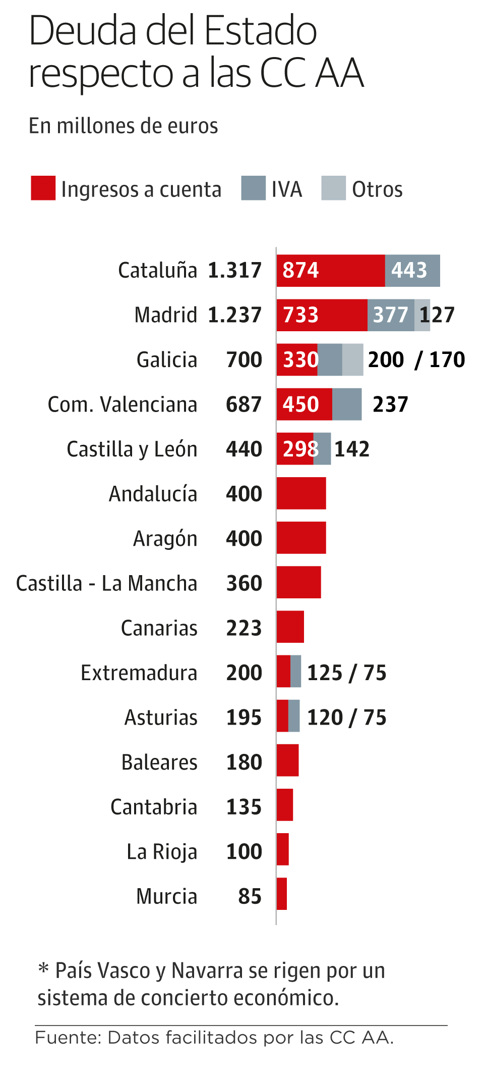 Los gobernantes autonómicos del PP salieron este miércoles en tromba a reclamar al Ministerio de Hacienda el pago de la deuda acumulada a costa de ... la financiación autonómica. Lo hicieron tras comprobar la inexistencia del informe de la Abogacía del Estado al que se aferraba el Gobierno para no ejecutar los desembolsos por estar en funciones. La suma adeudada a las comunidades se sitúa en torno a los 4.700 millones de euros por los anticipos a cuenta no satisfechos de la recaudación del IRPF de este año y otros 2.500 millones por una modificación en la liquidación del IVA de 2017.