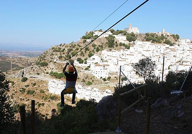 También hay una buena ración de adrenalina en este pueblo malagueño. En los últimos años, los que visitan esta localidad pueden atreverse a volar sobre el casco urbano gracias a una vertiginosa tirolina. Tiene unos 300 metros de longitud y una altura de unos 80 metros. Esa distancia, a vista de pájaro, se recorre en un intenso medio minuto. Este atractivo turístico, instalado desde finales de 2017, no tiene límite de edad, pero sí de persona (hay que estar entre los 40 y los 110 kilos). El precio es de 12 euros por persona, aunque hay algunos descuentos, como el que se ofrece a los empadronados, que sólo pagarían la mitad. Las reservas y compras de tickets deben hacerse en la Casa Natal de Blas Infante (abierta de lunes a viernes de 10:30 a 14:30 y de 16:30 a 18:00 horas; fines de semana y festivo, de 10:00h a 14:30 horas). Los no empadronados pueden adquirir directamente su entrada en la misma atracción.
