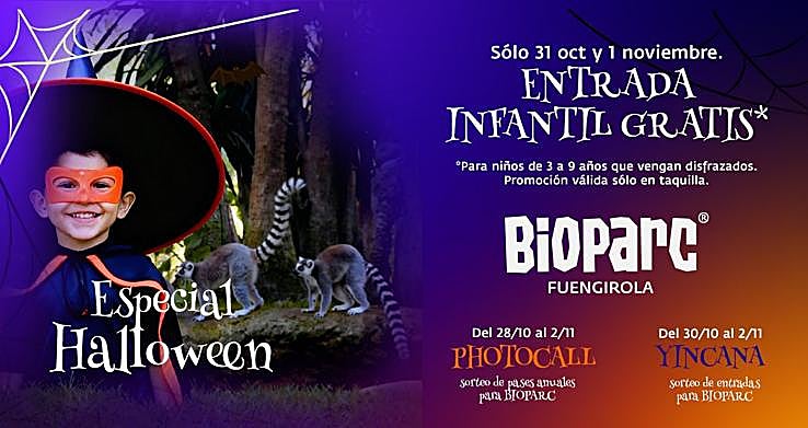 Los días 31 de octubre y 1 de noviembre, todos los niños de 3 a 9 años que vengan completamente disfrazados podrán acceder gratis al parque acompañados de una entrada general de adulto. Consulta condiciones en la web de Bioparcfuengirola.es Una oportunidad perfecta para vivir Halloween en familia rodeados de naturaleza y diversión.