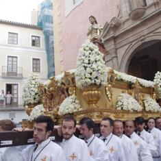 Por su parte, la Virgen Reina de los Cielos lució gladiolos rosas y rosas rosas, y estuvo precedida por nazarenos ataviados con túnicas de la Agrupación y fue acompañada musicalmente por la banda de música de la Paz, que interpretó la marcha 'Reina de los Cielos' a su paso por la plaza de la Constitución.
