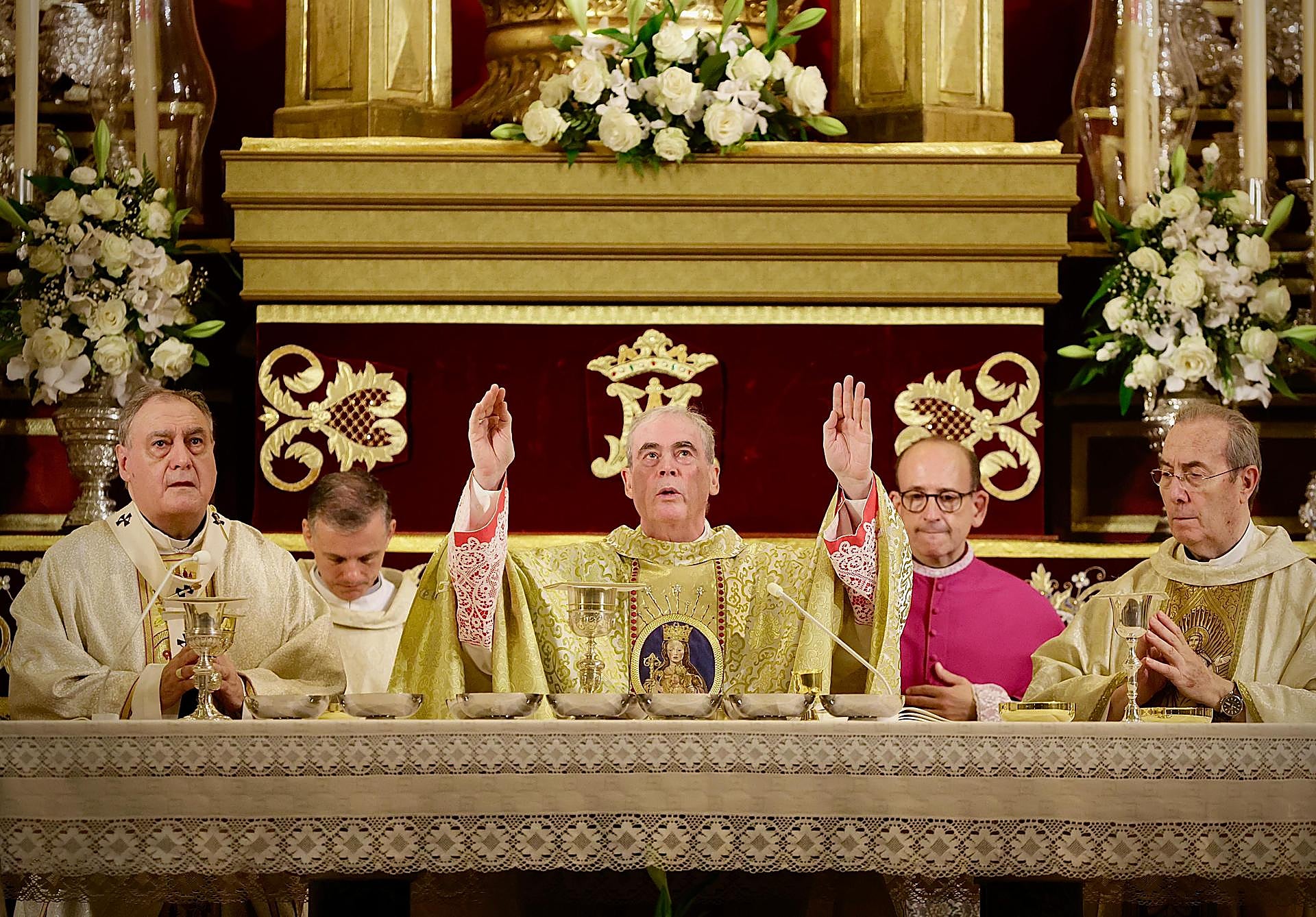 Santa María de la Victoria, la advocación más nombrada por Jesús Catalá desde que tomó posesión de obispo de Málaga, presidía el altar mayor del templo mayor de la diócesis como en los días anteriores. El prelado vestía con ornamentos blancos; es decir, casulla, estola, con una representación pictórica de la Virgen de la Victoria, y mitra blancas, tal y como es preceptivo por tratarse de la víspera de la solemnidad de la Natividad de la Virgen. Y junto a él, casi 80 concelebrantes, entre diáconos, sacerdotes diocesanos y canónigos de la Catedral, con su deán, José Manuel Ferrary, al frente, y el vicario general de la diócesis, Antonio Coronado. Asimismo, participaron en la eucaristía el arzobispo metropolitano de Granada, José María Gil Tamayo, que este lunes oficiará la misa estacional de la Patrona de Málaga a las 11.30 horas, y el arzobispo emérito de Pamplona y Tudela, Francisco Pérez González, que reside en el seminario malagueño. El coro de la Basílica de la Victoria amenizaba la ceremonia, como ya lo hizo durante el tercer y quinto día de la novena, e igualmente sonaba el órgano catedralicio, tocado por Antonio del Pino.