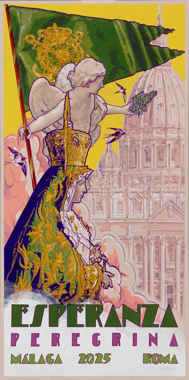 El cartel de Naranjo, con una importante obra creativa en los campos de la pintura –también realizó el cartel oficial de la Semana Santa de Málaga de 2015–, el diseño, la restauración y, ahora, también, como escultor, lo preside el busto de perfil de Virgen de la Esperanza vestida de reina, que se muestra a través de una composición dinámica en la que el autor resalta la peregrinación de la Dolorosa malagueña a Roma, el centro del cristianismo, con la basílica de San Pedro del Vaticano en un plano cenital como fondo del conjunto. Para ello, la imagen es transportada en una nube hasta la capital romana, acompañada de un ángel marmóreo, tomado del grupo escultórico 'Habacuc y el ángel', de Bernini, que hace de heraldo de la efigie mariana. Este ángel sostiene una bandera, ondeando al viento, con el escudo de la archicofradía, y en la otra mano lleva un ramito de romero, el romero de la Esperanza, y le indica a la Virgen el camino de llegada a Roma.