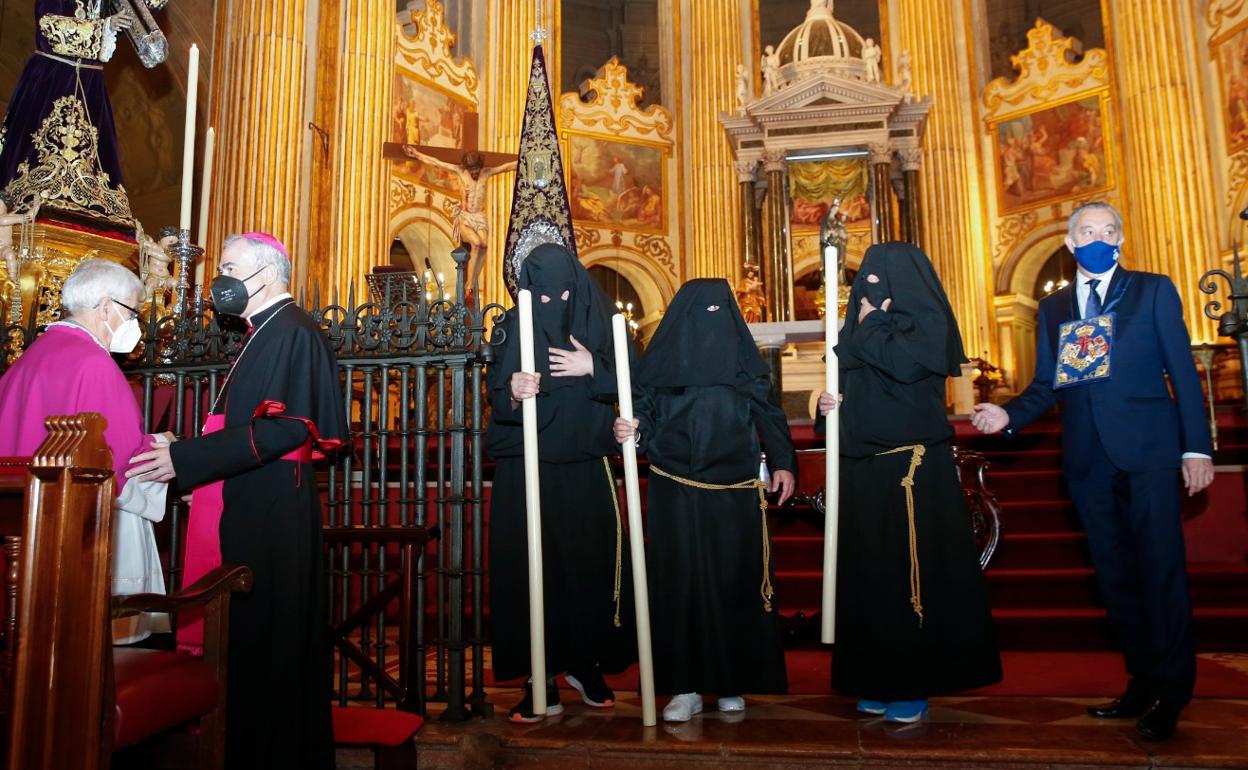 El acto solemne presidido por las imágenes de Jesús El Rico y la Virgen del Amor (que fueron trasladados de forma privada desde la iglesia de Santiago, a la conclusión de los actos celebrados por la mañana, hasta la Catedral, donde se situaron en sendas peanas en al altar mayor) estuvo cargado de emoción por la excepcionalidad de lo vivido en una atípica Semana Santa. El primer templo de la diócesis se une así a otros enclaves de la ciudad que han sido testigos, a lo largo de la historia, de la ceremonia de la liberación: la antigua prisión de mujeres –en la avenida de la Rosaleda–, la Aduana o la plaza del Obispo.