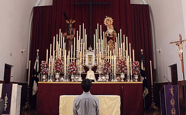 Este altar, que ayer fue visitado por cientos de personas, especialmente por los vecinos del barrio de Las Delicias, va a tener esta Semana Santa una doble función. Hasta ayer ha sido el altar para el quinario dedicado a los titulares de la corporación cofrade de esta iglesia de la avenida de Sor Teresa Prat, y hoy, Jueves Santo, servirá como monumento para reservar al Santísimo tras la celebración de los oficios. Para ello, las imágenes ya estarán situadas en sus capillas, y un farol del trono de la Virgen se ha adaptado como tabernáculo en el que guardar la presencia de Jesús sacramentado para la hora santa.