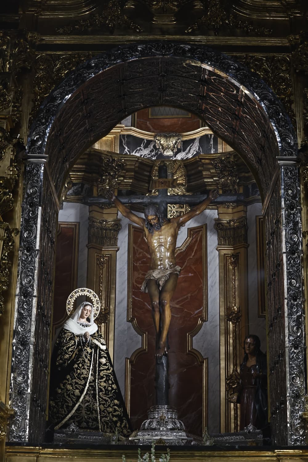 El conjunto impresiona. De arriba a abajo, de derecha a izquierda. Pero si hay una sección del retablo que llama especialmente la atención esa es la embocadura del camarín, que, si bien difiere de la obra primitiva, acertadamente su hechura y materiales empleados refuerzan el carácter sagrado del espacio donde se veneran el Cristo de la Buena Muerte, la Virgen de la Soledad y la Magdalena, al ser construido en orfebrería. Este «descomunal marco», calificó Pablo Krauel, semejante a un arco triunfal, labrado por el cordobés Manuel Valera, otra de las grandes firmas, en este caso, de la joyería y los metales, eleva la dignidad del conjunto.