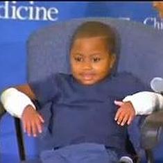 Este pequeño brillante y precoz, ahora camina con prótesis, y según los médicos se las había arreglado para aprender a comer, escribir e incluso jugar videojuegos sin usar manos. Incluso les dijo que ya tenía ganas de lanzar una pelota con sus nuevas manos.