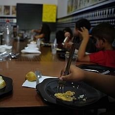 Niños pertenecientes a familias con escasez de recursos almuerzan en un comedor social.