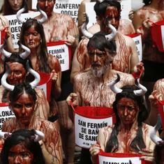 Un centenar de activistas se baña en sangre artificial para protestar contra los Sanfermines