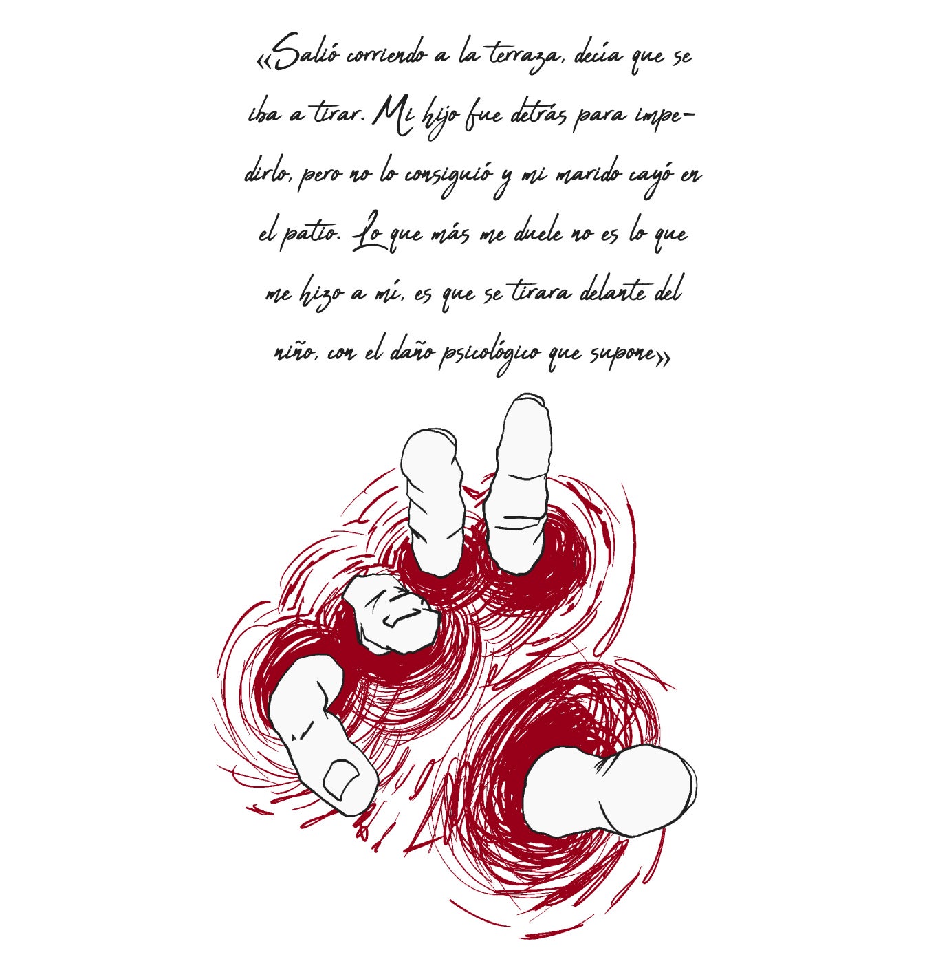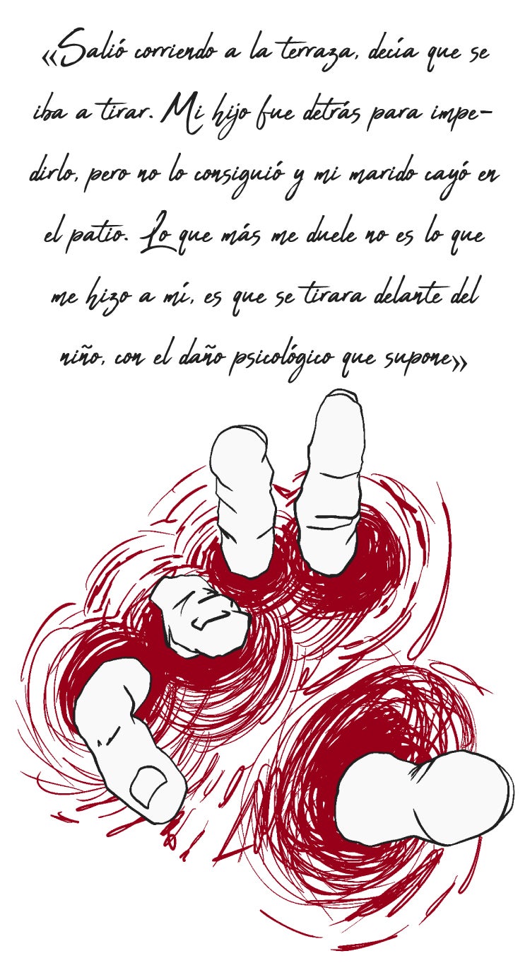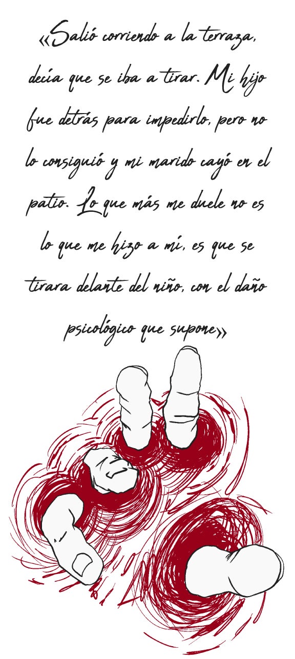 El chico escuchó gritos y llegó a la cocina. Encontró a su madre tirada, la tenía cogida por el pelo. No había visto cómo le clavaba el cuchillo en el cuello, pero sí cómo la atacó por la espalda. No dudó en aproximarse a él para quitarle el arma blanca. Trató de cogerlo por la hoja y resultó herido. Recibió varios cortes por parte de su padre. Después, este se autolesionó clavándoselo en el cuello y abandonó la estancia.