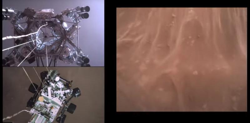 Luego se ve cómo se desprende el escudo de calor que protegió al róver en su descenso y posteriormente la llegada en el cráter Jezero en medio de una nube de polvo.