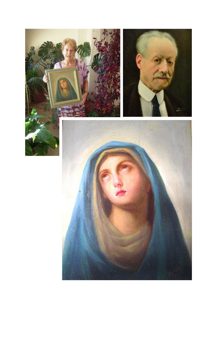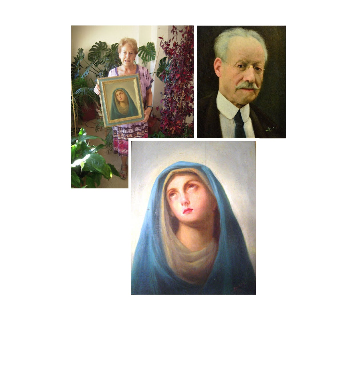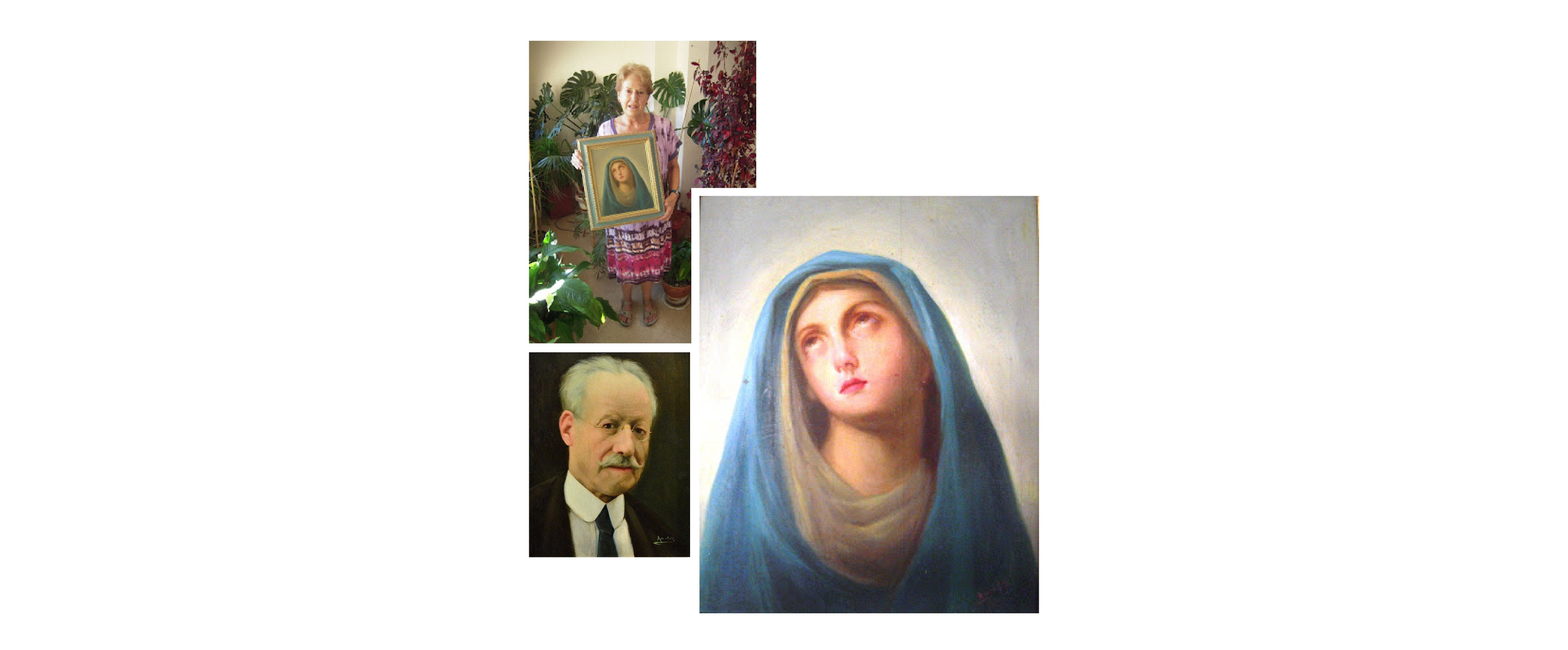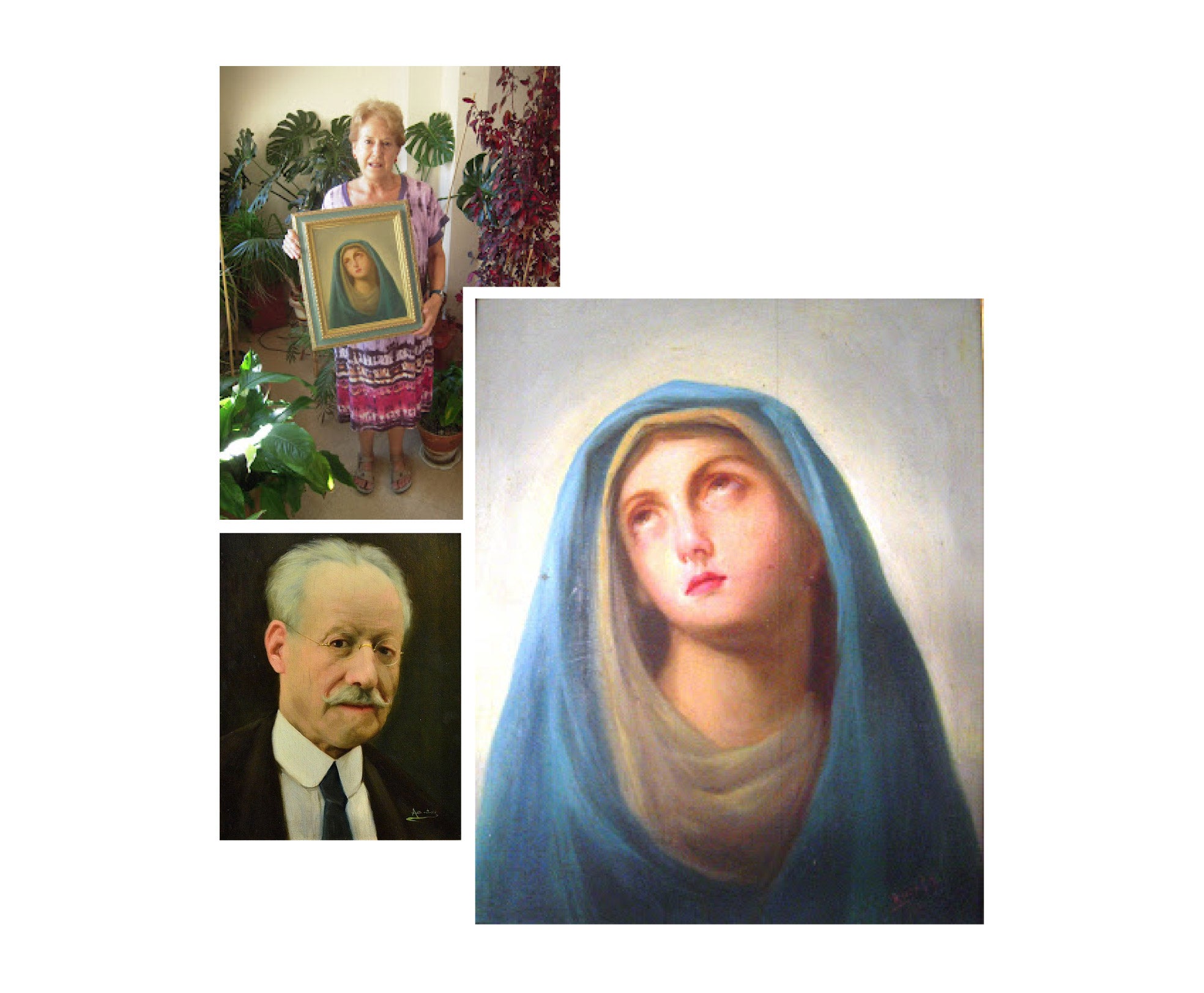 Teresa García, arriba a la derecha, entrega el lienzo que representa a la Virgen de los Dolores, firmado por Elías García en 1933. A la izquierda, un autorretrato del autor de 1927. CENTRO DE ESTUDIOS BORJANOS