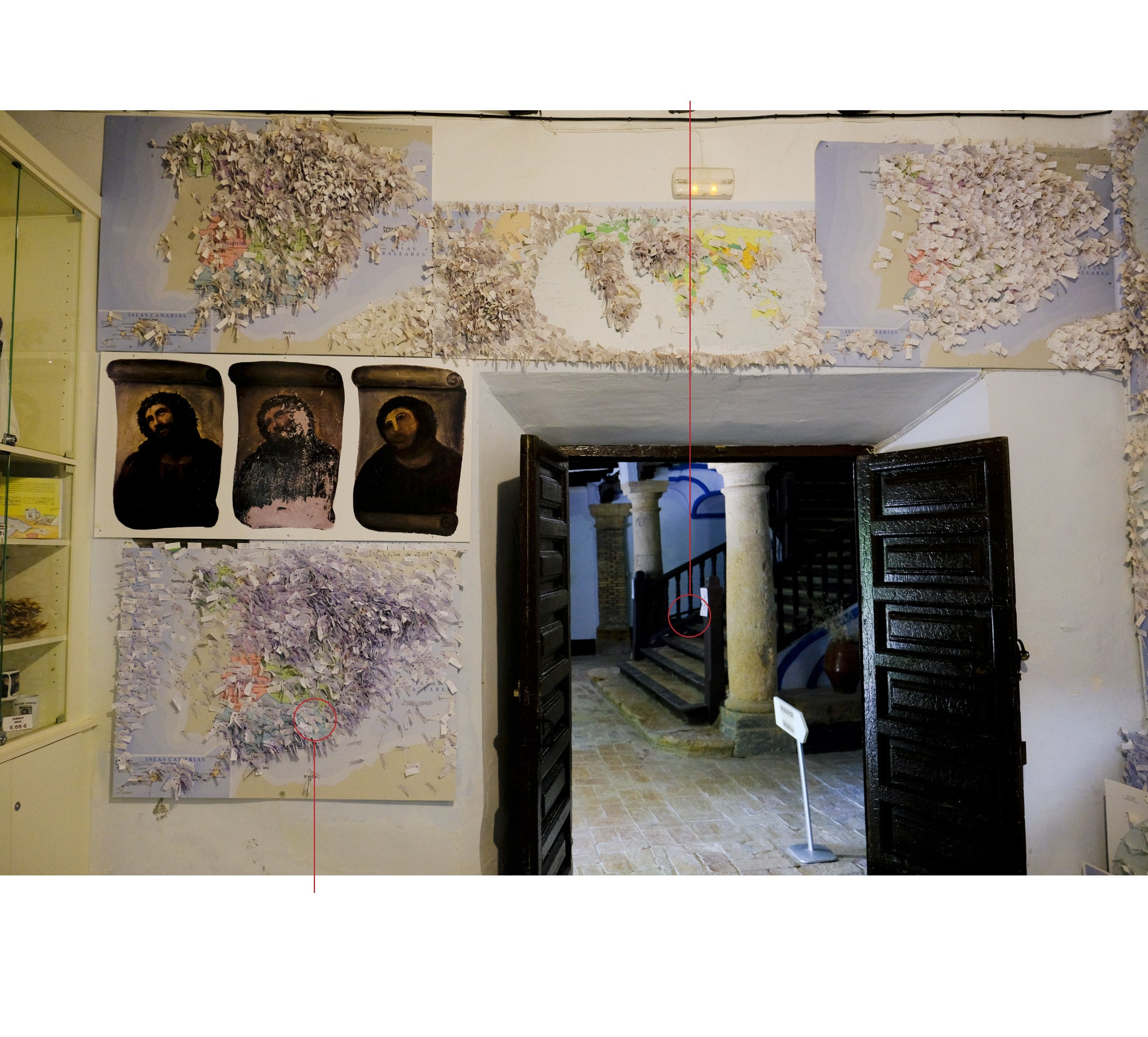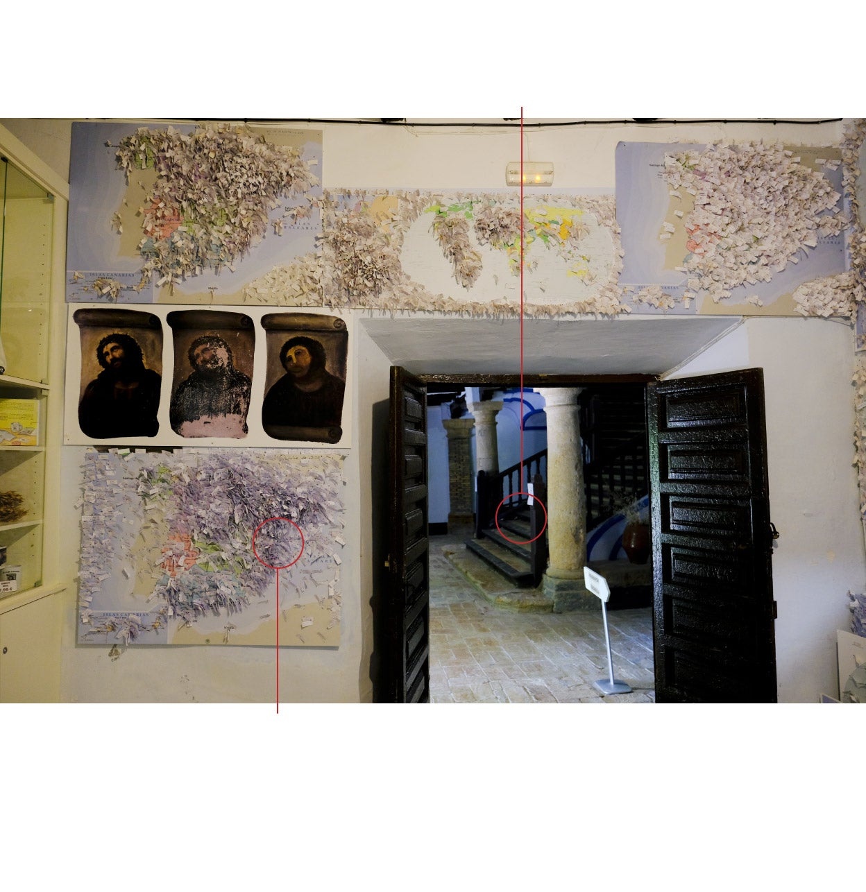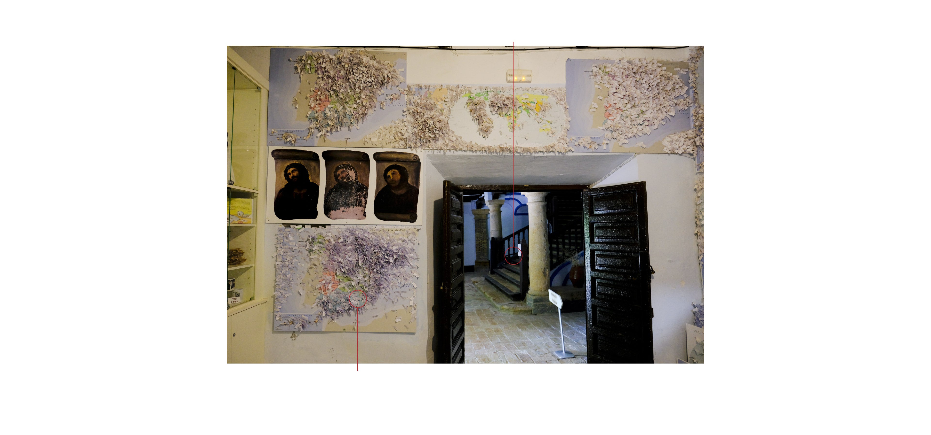 La imagen de la Virgen de los Dolores mira hacia la esquina superior izquierda. Igual que el Ecce Homo del Santuario, del que también hay una reproducción en la pared, previa al repinte. Allí se publicó el primer artículo que mentaba la «intervención». Fue un 7 de agosto de 2012. Se titulaba 'Un hecho incalificable'. Incluía la primera imagen publicada del Ecce Homo de Cecilia, que está fechada el 25 de julio de 2012. Mañana hará diez años.