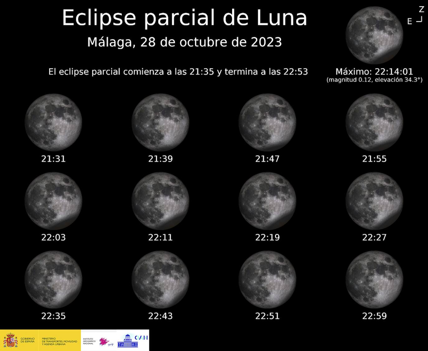 ¿Cuándo se podrá ver? El fenómeno podrá verse a diferentes horas según la zona del mundo. En España se podrá percibir poco después de las 21.30 horas, cuando la luna poco a poco empezará dejar de recibir por completo los rayos del Sol, provocando ese eclipse parcial. La web del Instituto Geográfico Nacional permite consultar las fases horarias según los distintos puntos de la península. En Málaga, el eclipse comenzará a las 21.35 horas del sábado y terminará a las 23:53. El punto máximo será a las 22.14 horas.
